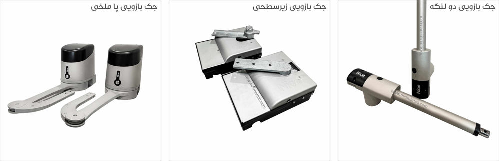 1-جک های بازوی: این مدل از جک پارکینگی دارای بازوهای مکانیکی می باشد که با توجه به نوع درب از یک یا دوبازو در زمان نصب استفاده میگردد و در چهار مدل جک بازویی دولنگه ، تک لنگه ، زیرسطحی و پاملخی تقسیم بندی میشود.