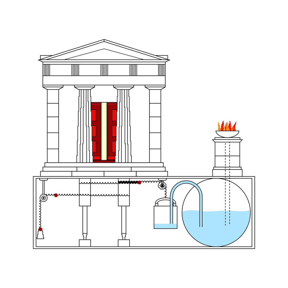 گرمای آتش آب را به درون ظرفی که بمانند وزنه عمل می کرد، پمپ می کرد و به چند طناب و قرقره امکان می داد تا درب های معبد را هنگام ورود مردم برای دعا باز کنند. وی بعداً برای باز كردن دروازه های شهر برنامه مشابهی را پیاده كرد. درب های اتوماتیک هارون بیش از 80 دستگاه مکانیکی مختلف بود که وی برای کار با فشار آب، بخار یا هوا طراحی کرده بود. جوزف نیدهامJoseph Needham) ) در کتاب خود با عنوان "علم و تمدن در چین" (Science and Civilization inChina)در سال 1986 باور داشت چینی ها در قرن هفدهم درب اتوماتیکی که با سنسورویا پدال پا کار می کرد اختراع کرده بودند. امپراتور یانگ از سوئی ، این درب را برای کتابخانه سلطنتی نصب کرده بود.