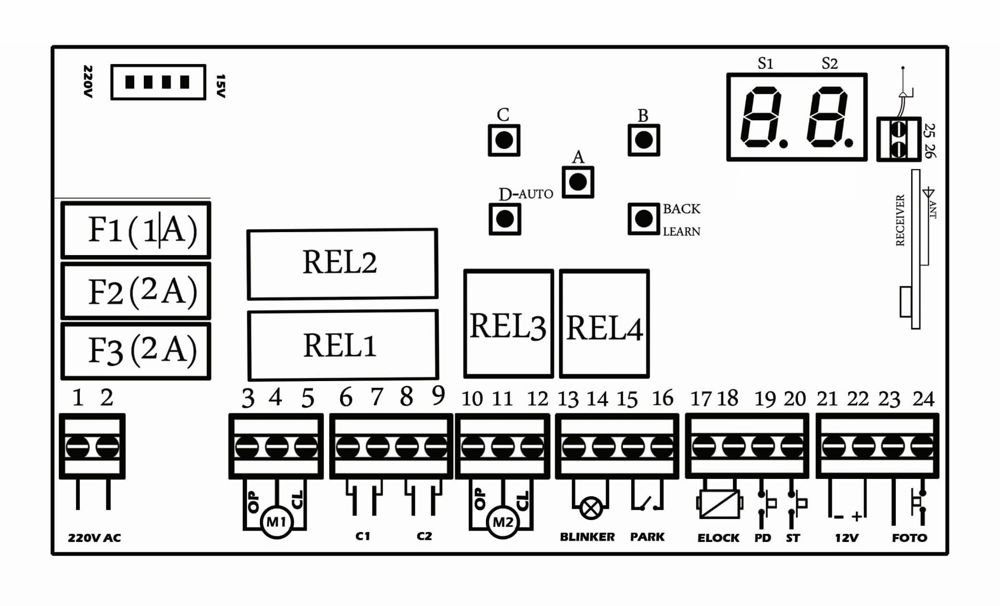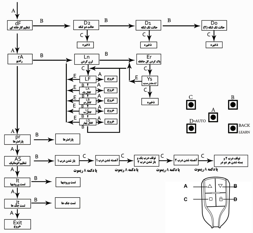 برای راه اندازی اتومـاتیک بازوها ابتدا درب ها را در حـالت بسته قرار دهید سپس دکمـه D روی مدار فرمان را نگـه دارید تا درب اول باز شود سپس با زدن دکمه اول ریمـوت یا دکمه C درب اول آهسته می شود سپس با زدن دکمه اول ریموت یا دکمه C درب اول متـوقف و درب دوم باز می شود.